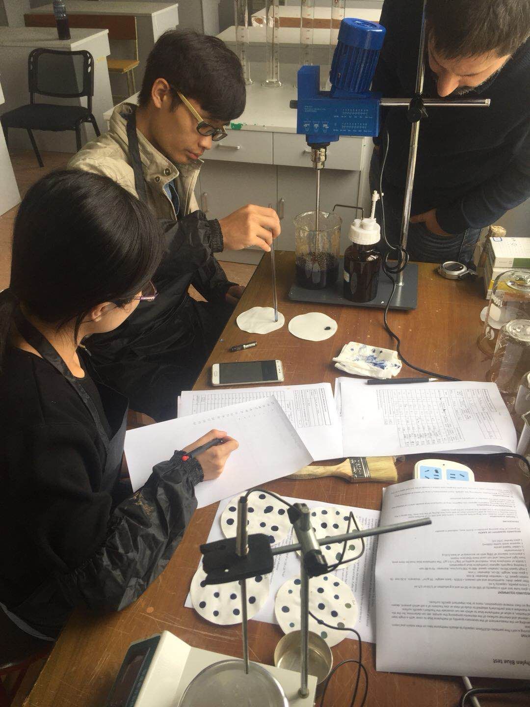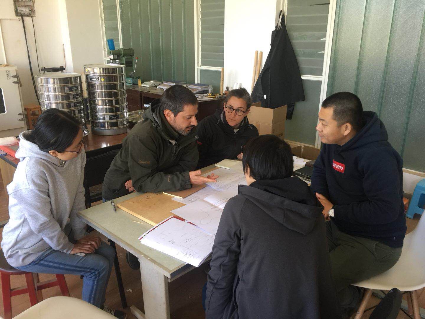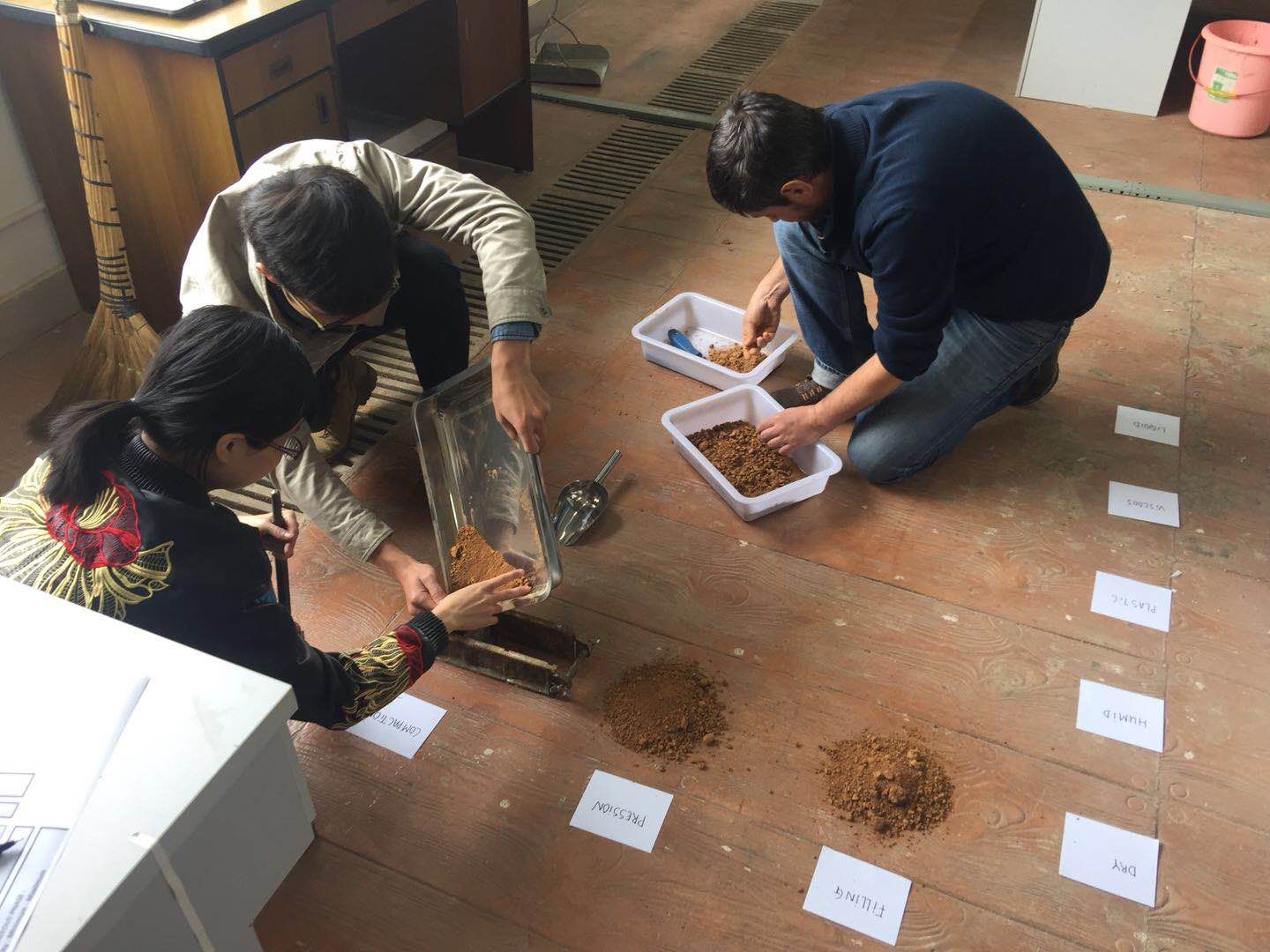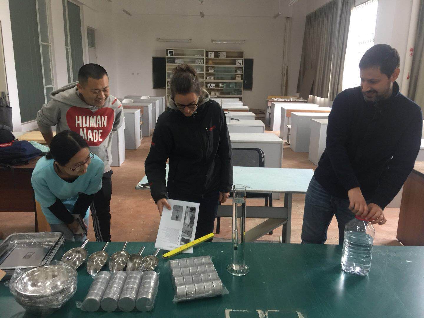在过去一个月里,法国专家针对实验室器材使用给我们的老师和同学进行了全面系统的培训、并且为中心建设所用土壤进行选样及一系列模拟测试,临时的生土检测实验室在建筑楼实验室里已初具雏形。