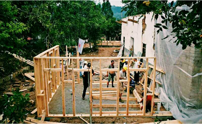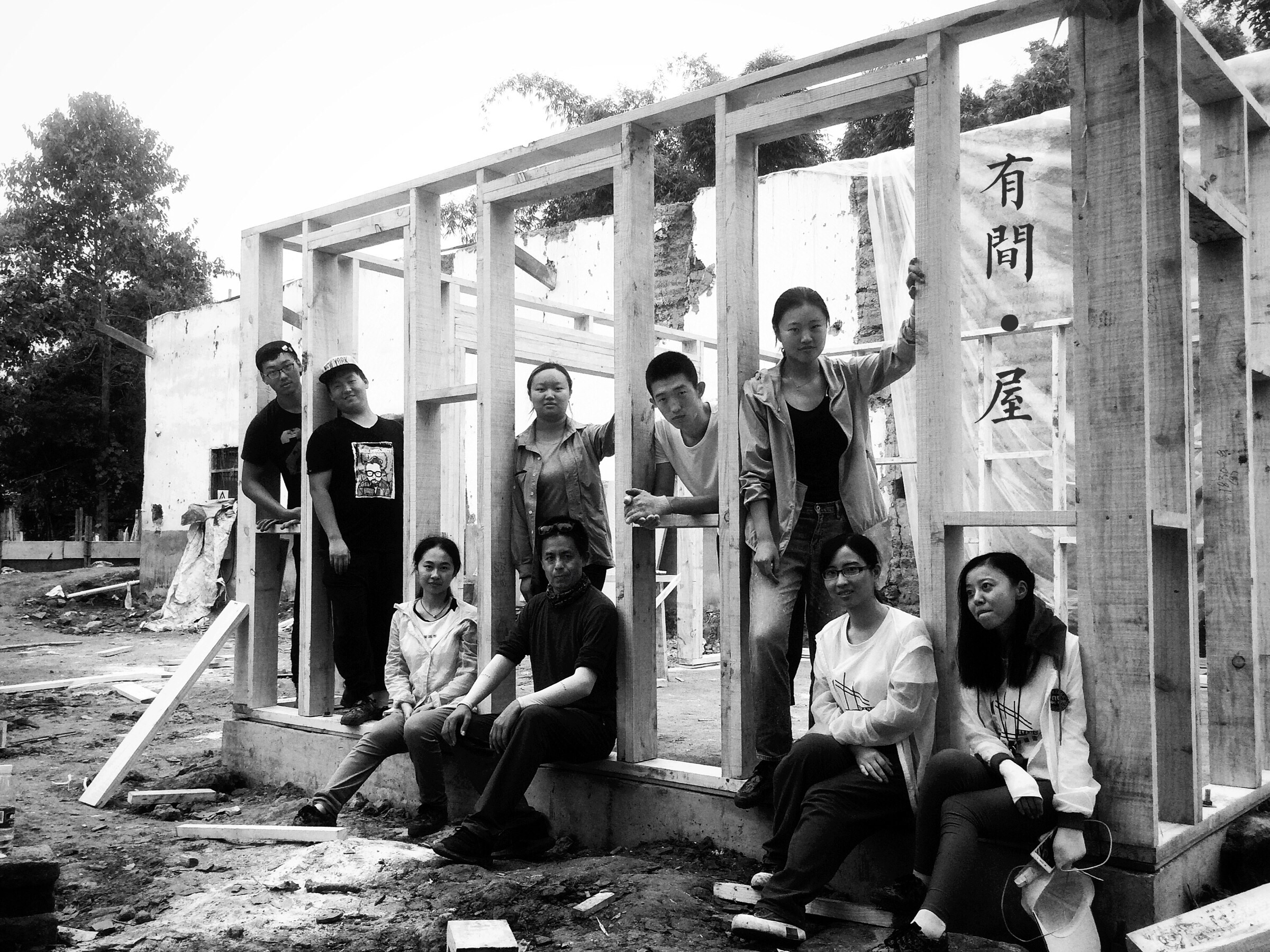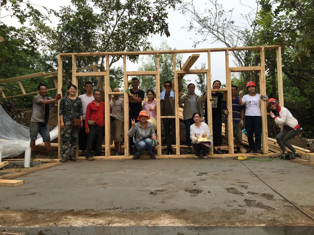 8月11日晚,所有师生安全抵达德阳市旌阳区国防训练基地。12日上午开营后,下午熟悉场地及周边环境,对接施工负责人。之后三天,在材料未到面临无法施工的情况下,团队积极讨论推导方案细节,清洗处理回收旧家具,收集竹编工艺品。8月16日中午,期待已久的木料抵达库房,团队积极工作,用了一下午的时间完成了划线切割及制作木龙骨的工作。第二天上午,在工人师傅的协助下,浇筑完成室内地坪,下午,竖起了“有间屋”第一面木龙骨。在之后6天的时间里“有间屋”团队在工人师傅急具效率的协助下,迅速完成了屋架,防水,平整场地等一系列主体建造工作。其中20日,在场地突临大雨的情况下,团队依旧有人驻守场地。21日,在面临不确定大雨的情况下,刘肇宁老师坚持工作,指挥工人师傅完成了屋架的建造。8月25日,在已知大雨的情况下,团队依然上山,坚持工作,完成了建筑外饰面及庭院小径。26日,最后一天,屋面完成盖瓦工作,积极布展,迎接第二天的评审。