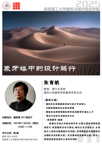 之邀,清华大学建筑学院博导、中国风景园林学会常务理事、景观学系系主任朱育帆教授为全院师生带来了一场题为“象牙塔中的设计笃行——专业经历的批判性回顾”的专题讲座,讲座作为“新时代风景园林学科发展与教育前瞻”学术周的重要组成部分,学院院长杨毅教授主持讲座,学院党委钟金栋书记和毛志睿副院长、教师代表以及部分学生共80余人聆听了讲座。